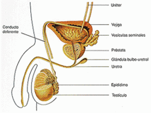 La próstata es una glándula masculina ubicada por debajo de la vejiga, que circunda la uretra , sirve como vía de paso obligatorio tanto a la orina como al líquido seminal (ver gráfico) Tiene un volumen parecido al de una nuez, aproximadamente de 20 cc y un peso de 25 grs, en varones menores de 45 años de edad. Produce sustancias que protegen a las vías urinarias de las infecciones – como el zinc-, además de secretar fructosa y ácido cítrico, componentes importantes del líquido seminal. Produce también una proteína conocida como antígeno prostático específico, que al encontrarse en grandes concentraciones en el líquido seminal, produce la licuación del mismo, favoreciendo el desplazamiento de los espermatozoides en el proceso de fecundación.