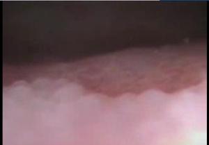 Imagen de trígono vesical durante cistoscopía, obsérvese el cambio de la mucosa vesical,con apariencia algodonosa.