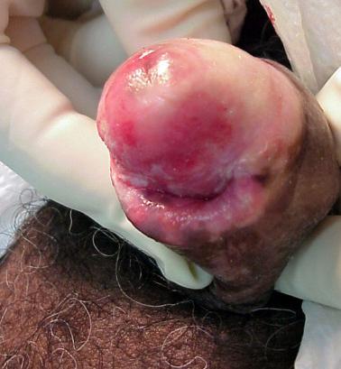 Paciente con balanitis, quien posteriormente fué sometido a cirugía. El resultado anatomopatológico indicó Enfermedad de Bowen, un tipo de Cancer de Pene localizado.