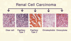 El Carcinoma de células renales tiene 5 subtipos histológicos, como sigue: de células claras (75%), cromofílico (15%), cromófobo (5%), oncocitoma (3%), y el conducto colector (2%).