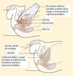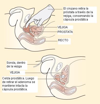 - La técnica transvesical (algunos la denominan suprapúbica), en la cual luego de realizar una incisión en el abdomen bajo, se accede a la próstata a través de la vejiga (es decir se abre la vejiga y es a través de esta que se realiza la cirugía)