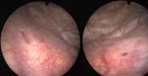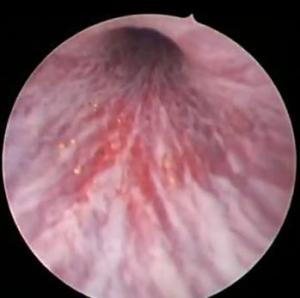 Algunas imágenes de la cistoscopía de un paciente varón con síntomas urinarios bajos severos. (la cistoscopía recomendó la realización de vídeo resección transuretral de próstata)