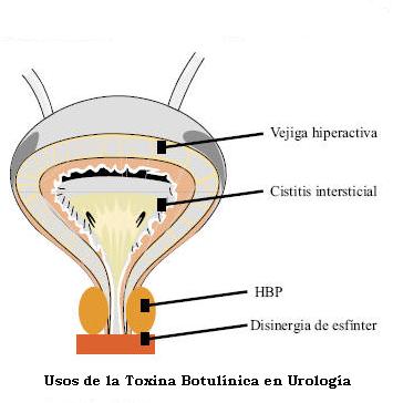 La Toxina Botulínica Tipo A (BoNTA), ha sido utilizada con éxito en el tratamiento de pacientes con lesiones de la médula espinal que presentan disinergia vésico-enfinteriana, y en el tratamiento de la vejiga hiperactiva de origen neurógeno y no neurógeno con TBON-A, mostrando éxito en varias partes del mundo.