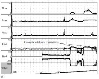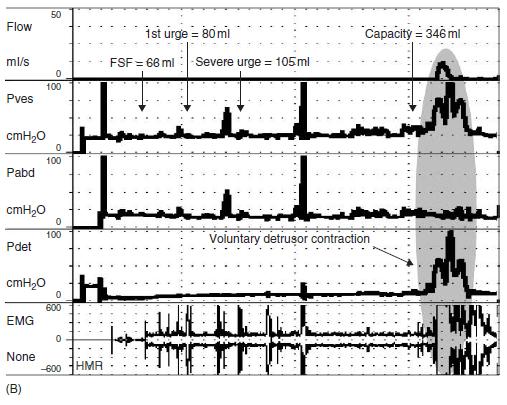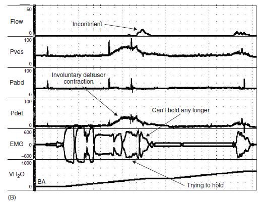 El paciente refiere síntomas de vejiga hiperactiva (urgencia, polaquiuria), pero no se evidencian contracciones involuntarias del detrusor en la cistometría.