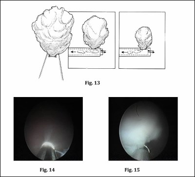 Durante todo el proceso de la morcelación se utilizan dos entradas de suero salino para que la vejiga este totalmente distendida. Sólo cuando la vejiga esta totalmente distendida se activa la succión para capturar los fragmentos (Fig. 13, 14), y una vez capturados se sigue presionando el pedal para activar las cuchillas (Fig. 15).