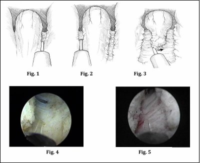 Se realizan dos incisiones bilaterales a las 5 y 7 horas (Fig. 1 y Fig. 2), extendiéndolas desde el cuello vesical hasta el verumontanum. Se profundiza hasta alcanzar el nivel de la cápsula prostática, la cual puede ser claramente identificada como una capa fibrosa lisa (Fig. 4). Es importante crear las incisiones lo suficientemente anchas (con bordes claramente definidos) para aislar el lóbulo medio y definir al mismo tiempo la base de ambos lóbulos laterales. En la Fig. 5 se distingue la separación entre el lóbulo derecho y el lóbulo medio.