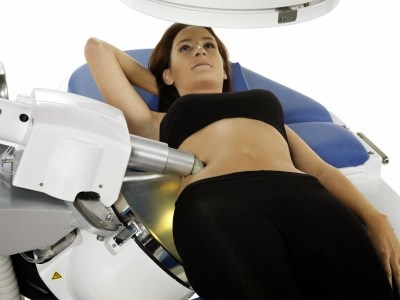 Paciente ubicada en la camilla, mientras el Litotripsor envia las ondas de choque, destruyendo los cálculos.