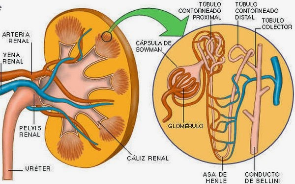 En el dibujo superior vemos en la imagen amplificada al responsable de la filtración que es el Nefrón. Los riñones tienen miles de nefrones, y son los verdaderos filtros microsópicos encargados de la limpieza de las toxinas de la sangre.