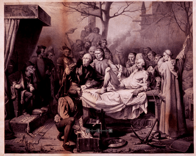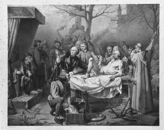 Próximo al cadalso, los médicos y cirujanos de París hicieron una singular petición al rey Luis XI, con la cual el reo podría evitar la muerte, si consintiera ser “anatomizado vivo” con el fin de valorar patologías comunes. Según la historia, el arquero sobrevivió a la disección y su historia perduda en esta singular imagen.