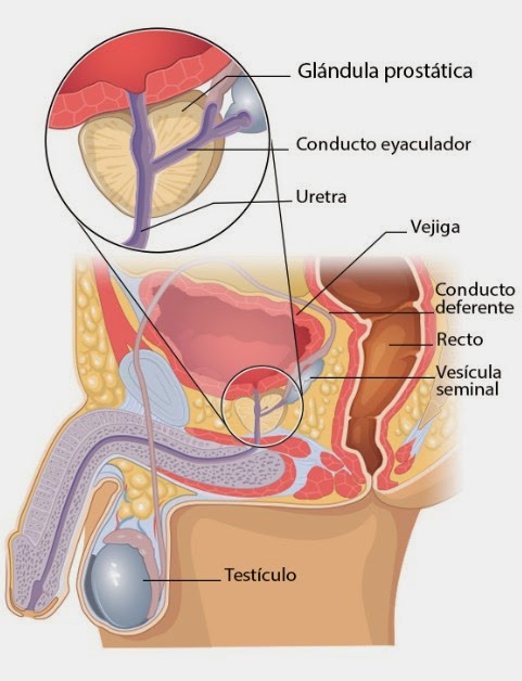 La próstata es una glándula ubicada debajo de la vejiga, y como se ve en el dibujo es atravezada por la uretra. De ahí que los primeros síntomas del cáncer sean justamente miccionales, es decir molestias para orinar.