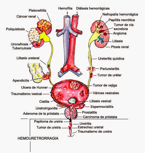 La ptosis renal, la hidronefrosis y el riñón poliquístico originan hematurias que se asemejan a las de los procesos tumorales. Los procesos congestivos bajos se relacionan casi en su totalidad con causas prostáticas y se acompañan de los demás elementos del síndrome prostático.