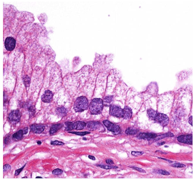 El PIN consta de acinos prostáticos arquitectónicamente benignos y de conductos revestidos por células citológicamente atípicas y confinados al epitelio. La capa de células basales está presente, aunque la membrana basal puede estar fragmentado.