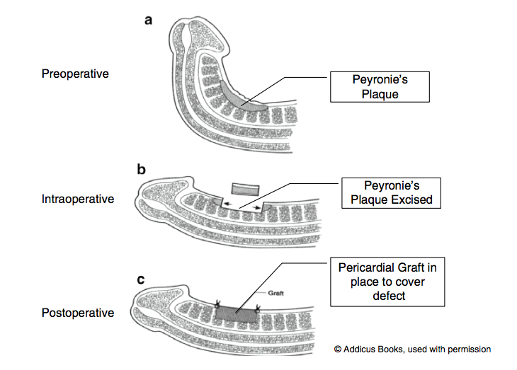 Esto implica la incisión de la placa de inserción con parche venoso para alargar el lado afectado y minimizar el acortamiento del pene. Otros injertos incluyen injertos no autólogos de la dermis, submucosa intestinal porcina (SIS) o pericardio, o autoinjertos de dermis o fascia recto abdominal.