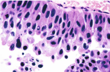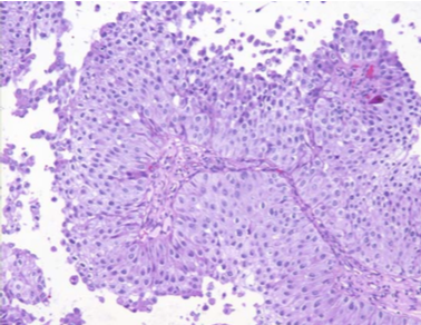 | Carcinoma Papilar de Alto Grado. Muestra obtenida de biopsia de vejiga. Se evidencia un incremento en el ratio núcleo citoplasma e hipercromasia nuclear. |