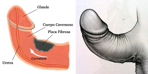Debido a la presencia de la placa, el cuerpo cavernoso subyacente a la lesión no es capaz de alargarse por completo durante la erección, lo que resulta en la curvatura del pene. La curvatura del pene además, puede estar asociada a flacidez distal o a un pene inestable (debido a la fibrosis cavernosa).