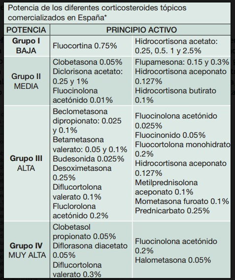 Es la sustancia principal contenida en la crema. Su efecto sobre la piel (potencia) depende de tres factores: las características de la molécula, la concentración en la que se halla y el vehículo utilizado. Con el fin de establecer una estandarización en cuanto a la potencia antiinflamatoria se han desarrollado sistemas de clasificación. En Europa se clasifican en cuatro grupos: baja, media, alta y muy alta los que mostramos en la tabla. Aunque la concentración también determina la potencia, esto no es siempre así, debido a que la curva dosis-respuesta alcanza una meseta para cada corticosteroide y, una vez alcanzada, no se modifica su efecto aunque se incrementa el riesgo potencial de efectos secundarios. El tipo de corticoide a utilizar va a depender también de la zona a tratar.