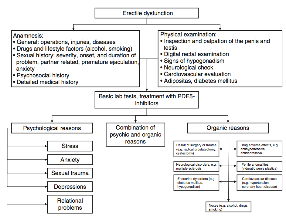 • Médico y quirúrgico: antecedente de hipertensión; enfermedad cardiaca; enfermedad vascular periférica; diabetes mellitus; trastornos endocrinológicos o neurológicos; cirugía pélvica, radioterapia, o trauma (inervación perjudicial y el suministro de sangre a la pelvis y el pene).