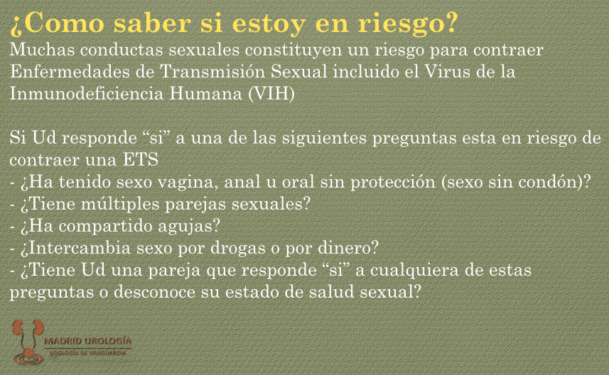 SI Ud tiene relaciones sexuales sin condon, tiene una ETS o recientemente ha tenido una, o tiene una nueva pareja y no esta seguro de su salud sexual solicite una consulta con un personal sanitario cualificado, su médico de atención primaria o su Urólogo para protegerse y proteger a su pareja contra enfermedades de transmisión sexual. Consulte los recursos al final de esta guía para obtener más información.