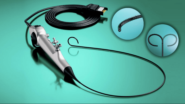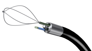 | Detalle de Ureterenoscopio y canales de trabajo que incluye laser y canastilla de extracción de litiasis |