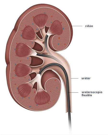 ** Con energía laser: El ureteroscopio flexible puede negociar ángulos agudos y el láser se pueden utilizar para dividir obstrucciones.