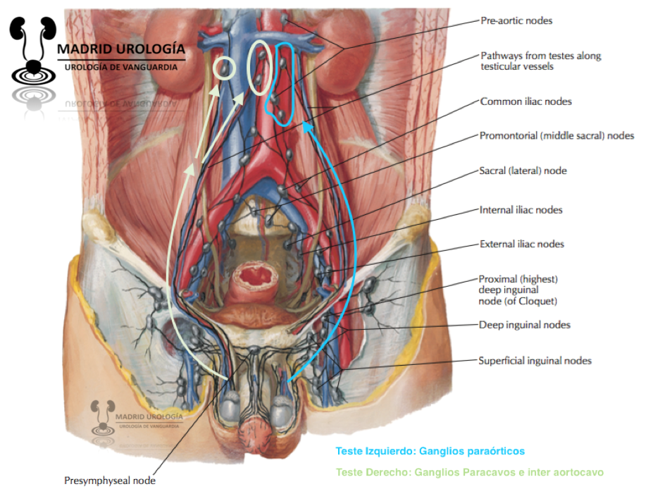 Así, el Testículo Derecho drenara hacia los ganglios Paracavos e Interaortocavos y el Teste Izquierdo a ganglios Paraórticos.