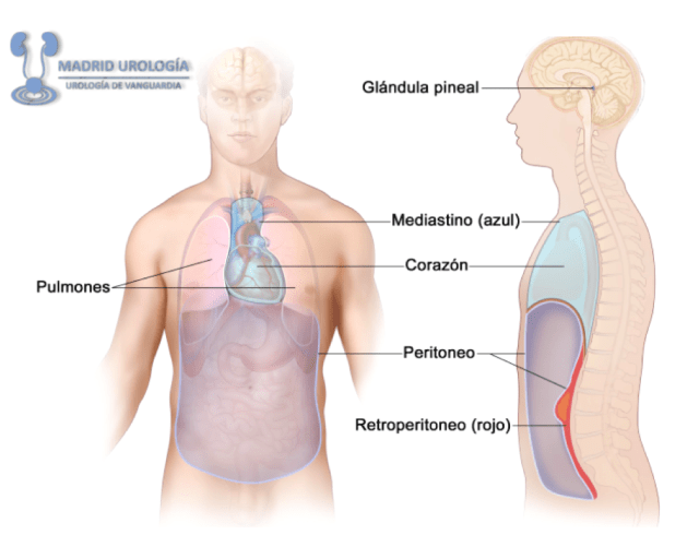 | Esquema que demuestra la localización del Retroperitoneo y del Mediatino. Claves para la compresión de la Historia Natural del Cáncer de Testículo. |