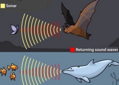 Un ecógrafo es un aparato que emite ondas de sonido, y que luego las recibe, todo ello a través de un transductor. El principio físico es muy similar a los sonares naturales que poseen los delfines y los murciélagos: ellos emiten ondas que luego»chocarán» contra un cuerpo sólido, y perciben de regreso el impacto de esas ondas, orientándolos, en el caso de los murciélagos en el vuelo, y en el caso de los delfines para buscar alimento.