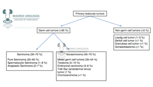 La siguiente tabla muestra la nueva clasificación adoptada por la WHO 2016 para los tumores de testículo e incluye los tumores no relacionados con los TCGT.