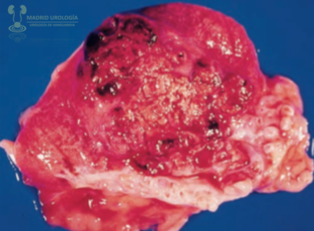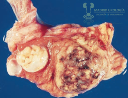 | Carcinoma embrionario con nodulo grande mostrando zonas de hemorragia y necrosis. Para MU con fines docentes. |