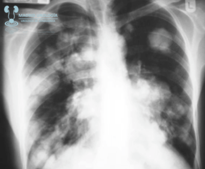 | Metástasis pulmonares en suelta de globos en un caso de TCG No Seminomatoso. Recuerde que en un 10 % de los casos las imagenes de nóduoos pulmonares no son valorables mediante radiología simple. |