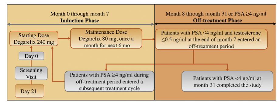 El período de inducción comienza con Degarelix 240 mg seguido de dosis adicionales de 80 mg al mes por 6 meses seguido de período libre.