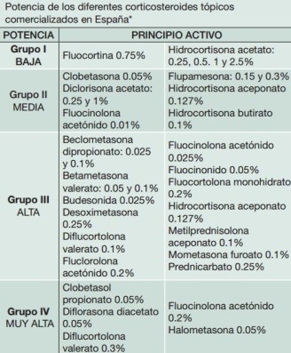 Es la sustancia principal contenida en la crema. Su efecto sobre la piel (potencia) depende de tres factores: las características de la molécula, la concentración en la que se halla y el vehículo utilizado. Con el fin de establecer una estandarización en cuanto a la potencia antiinflamatoria se han desarrollado sistemas de clasificación. En Europa se clasifican en cuatro grupos: baja, media, alta y muy alta los que mostramos en la tabla. Aunque la concentración también determina la potencia, esto no es siempre así, debido a que la curva dosis-respuesta alcanza una meseta para cada corticosteroide y, una vez alcanzada, no se modifica su efecto aunque se incrementa el riesgo potencial de efectos secundarios. El tipo de corticoide a utilizar va a depender también de la zona a tratar.