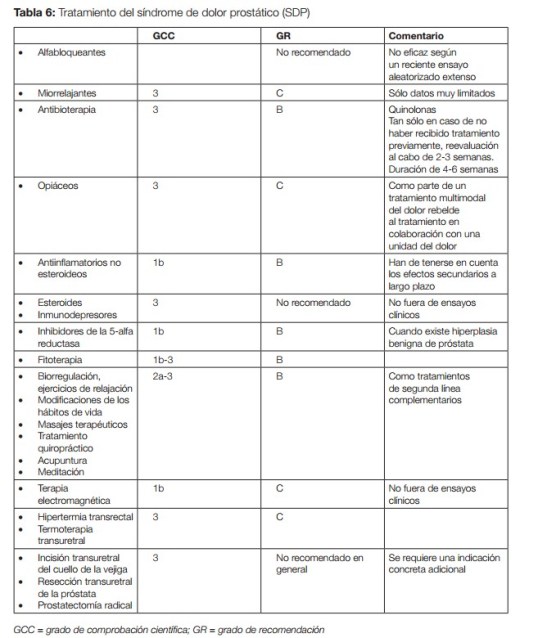 El tratamiento antibiótico es empírico y su uso se ha fundamentado en la respuesta sintomática. Los pacientes que responden a los antibióticos deben seguir con la medicación durante 4‑6 semanas o incluso más tiempo. Por desgracia, el cultivo y la presencia de leucocitos y anticuerpos en muestras específicas de la próstata no predicen la respuesta a los antibióticos en los pacientes con SDPC. Las quinlonas y sulfas en nuestro medio no las recomendamos como primera elección.
