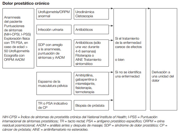 La mayoría de exámenes recomendados en casos de prostatitis crónica bacteriana son útiles también en el SDPC, por lo que no los repetiremos con fines de economía del lenguaje. Debemos hacer hincapié de que cada caso debe ser individualizado.