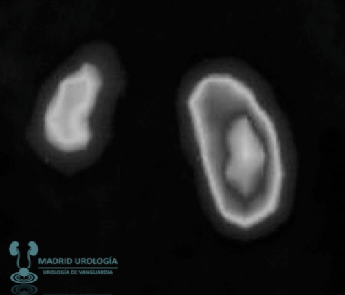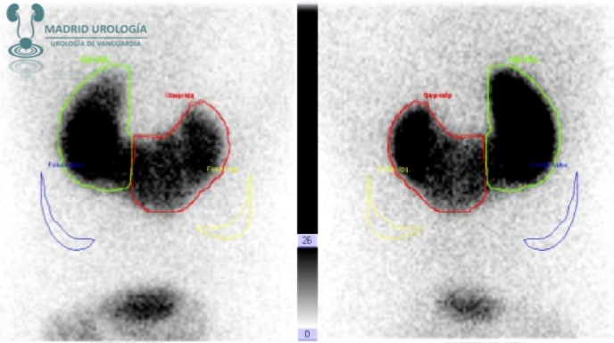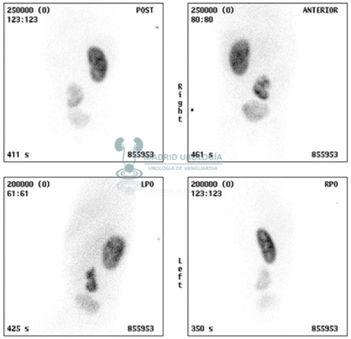 | Renograma DMSA mmostrando riñón izquierdo de menor tamaño y con parenquima hipocaptante, compatible con secuela post-reflujo. |