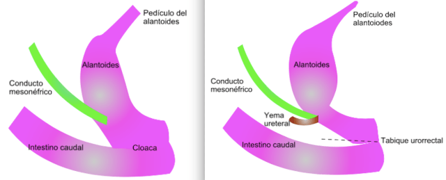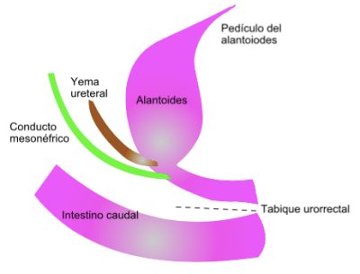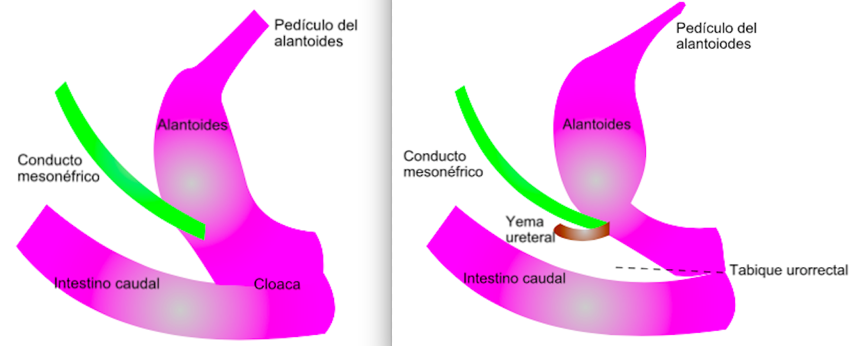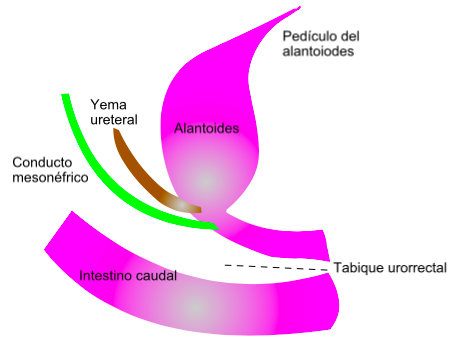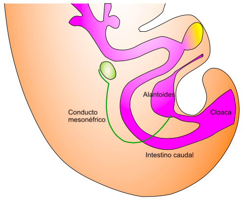 A uno y otro lado del intestino terminal y en un plano algo posterior a este, se ven los conductos wollfianos, que abordarán la cara posterior del alantoides desde el interior de aquel tabique, formando además los márgenes laterales del tubérculo de Müller.