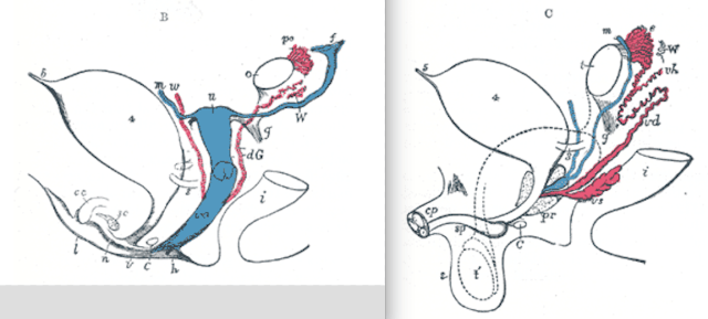 En el caso de la mujer, los conductos de Müller (azul) desarrollaran las trompas de Falopio, el utero, y los dos tercios anteriores de la vagina. Quedando representados en la imagen al final del desarrollo con su extremo distal cerca a la zona genital.