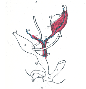 | En azul los conductos de Müller y en rojo los conductos de wolff. 5: uraco, 4 vejiga, cl: cloaca, i: intestino, cp: tubérculo fálico. |