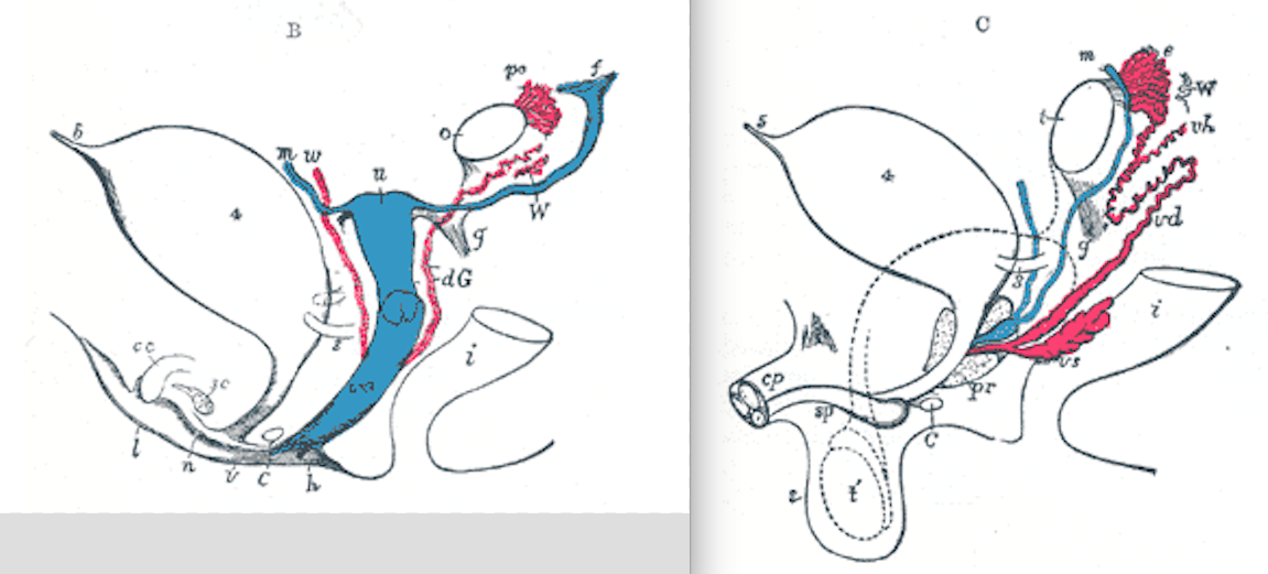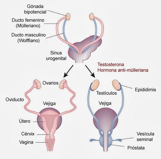 | A la izquierda el desarrollo de los genitales externos femeninos y a la derecha el de los masculinos. En azul los conductos de Müller y en rojo los conductos de Wolff. |