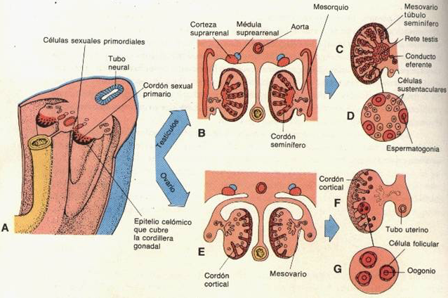 Una vez alcanzada la gónada indiferenciada, los futuros gametos son masculinos, avanzan hasta las estructuras cordonales, se instala en su interior y van a ser espermatogonias, en tanto que los cordones serán los tubos seminíferos.