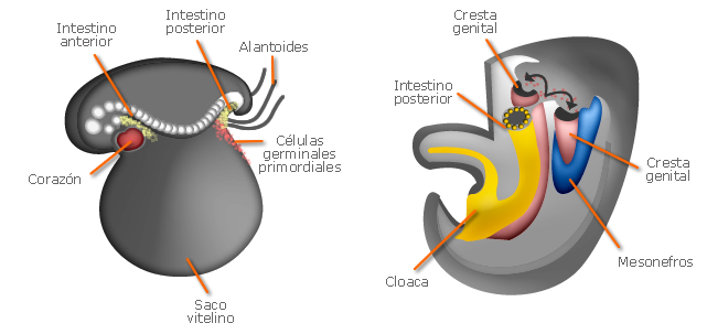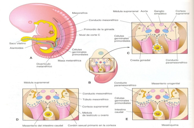 Hasta la 7a semana, no poseerá las células germinales de su sexo cromosómico y se conforma como una gónada sexualmente neutra o totipotente. La célula germinales (bien distinguibles de la somáticas) en un principio están en la pared posterior del saco vitelino cerca de su boca de comunicación con el tubo endodérmico. Desde allí (esto empieza el 2omes de la gestación humana y dura dos semanas) migran, se multiplican, y van por los intersticios de lo que sería el mesenterio y el retroperitoneo en pos de la gónada indiferenciada, a cada lado.
