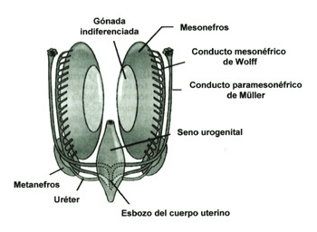 En la mujer los componentes wolffianos no tienen destino y desaparecen aunque suelen quedar restos embrionarios (paraóforo y los conductos de Gartner). Su sistema genital es mülleriano estricto (vagina, útero, trompas). Ver sección3.