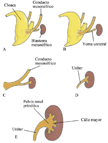 Para la 5 a semana del desarrollo el brote de Kupffer o yema ureteral que surge del conducto mesonéfrico (de Wolff) en su parte craneal penetra en el blastema metanéfrico y se ramifica, primero dando los cálices; partiendo del extremo de cada uno de estos se produce una primera generación de colectores cuyo fondo ampular es rodeado por una condensación de elementos celulares de aquel de las demás, la cual remeda un capuchón.