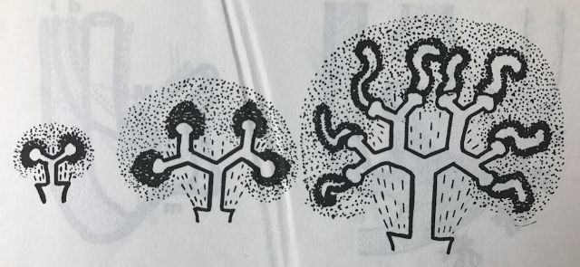 En cada capuchón se esbozan nefrones, pero esto se desintegran si ese fondo, con aspecto de ampolla de lugar a una nueva división, que desde este momento será dicotómica, y cada rama tendrá a su vez una dilatación distal ampular envuelta por una nuevo casquete de nefrogénico.