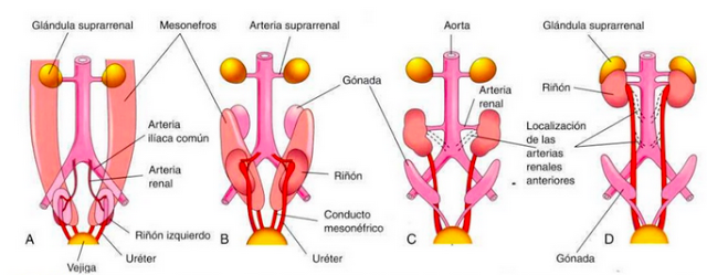 En esta última alcanza la voluminosa glándula suprarrenal en la parte superior del celoma de retroceloma. El acceso va asociado a una rotación, de modo que la vía excretora que abordaba el riñón por delante termina entrando en su hilio por el borde antero-interno. Mientras el riñón está intrapélvico, se nutre de las arterias iliacas; luego se van apropiando de ramas cada vez más altas del tronco aórtico; al llegar a la zona lumbar alta, la más caudal de las arterias que nutre a la suprarrenal le proporciona lo que será la arteria renal definitiva. La lobulaciones fetales van atenuándose a medida que el parénquima crece con las nuevas generaciones nefríticos y terminara de modelarse al ir transcurriendo el tiempo . La rapidez de estos cambios es asombrosa. Hay que recordar que un embrión humano mide unos 15 mm en la 6a semana, unos 45 mm en la 9a y de 90 mm en la 12a semana aproximadamente.