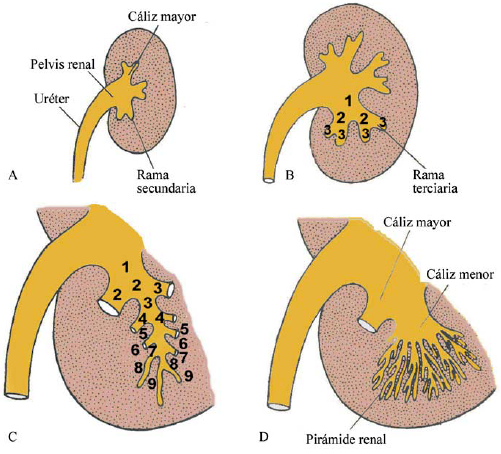 Para la 5 a semana del desarrollo el brote de Kupffer o yema ureteral que surge del conducto mesonéfrico (de Wolff) en su parte craneal penetra en el blastema metanéfrico y se ramifica, primero dando los cálices; partiendo del extremo de cada uno de estos se produce una primera generación de colectores cuyo fondo ampular es rodeado por una condensación de elementos celulares de aquel de las demás, la cual remeda un capuchón.