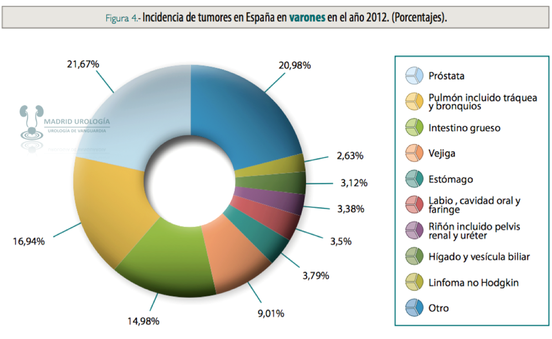 La siguiente tabla ilustra la Incidencia del cáncer en el varón. En la cual el cáncer de vejiga ocupa el 4º lugar de incidencia. En el caso de la mujer, el cáncer de vejiga se agrupa en el grupo de «otros» y no forma parte de los 10 primeros tumores malignos en dicho genero.