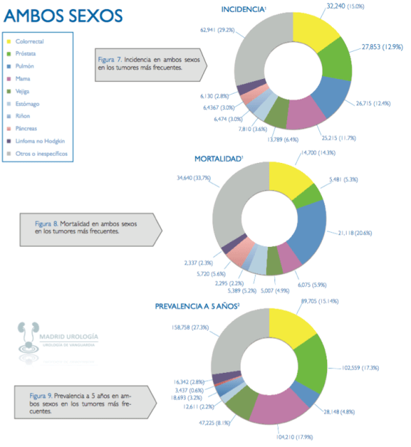 La siguiente tabla ilustra la Incidencia, la Mortalidad y la Prevalencia de todos los cánceres en España. Notese que el Cáncer de vejiga ocupa el 5º lugar de incidencia de todos los tumores en ambos sexos con una mortalidad baja y una prevalencia intermedia. Tomado de Las Cifras del Cáncer en España 2016. SEOM 2016″