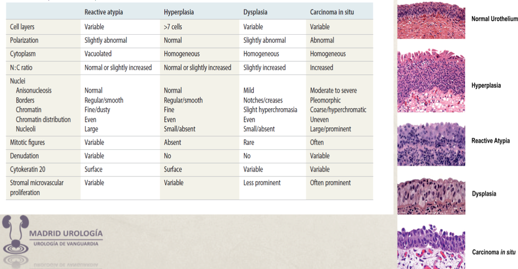 La siguiente tabla muestra las diferencias histológicas de las lesiones planas. Cabe resaltar que la Proliferación Urotelial de Potencial Maligno Incierto (Hiperplasia Urotelial) conserva gran parte de las características de una célula sana respecto al resto de lesiones, siendo distinguible en todo caso la mayor capa de células en su arquitectura.