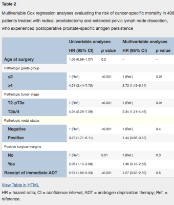 En el análisis multivariante los grados de grupo patológico mayores o iguales cuatro y los estadios patológicos de T3b / T4 fueron asociados independientemente con MCE. El grado de grupo patológico, el estadio patológico el estatus de los ganglios afectados, los márgenes quirúrgicos y el uso inmediato de TDA fueron incluidos en un modelo para predecir el riesgo de MEC a los 10 años en pacientes con PSA persistente después de cirugía .